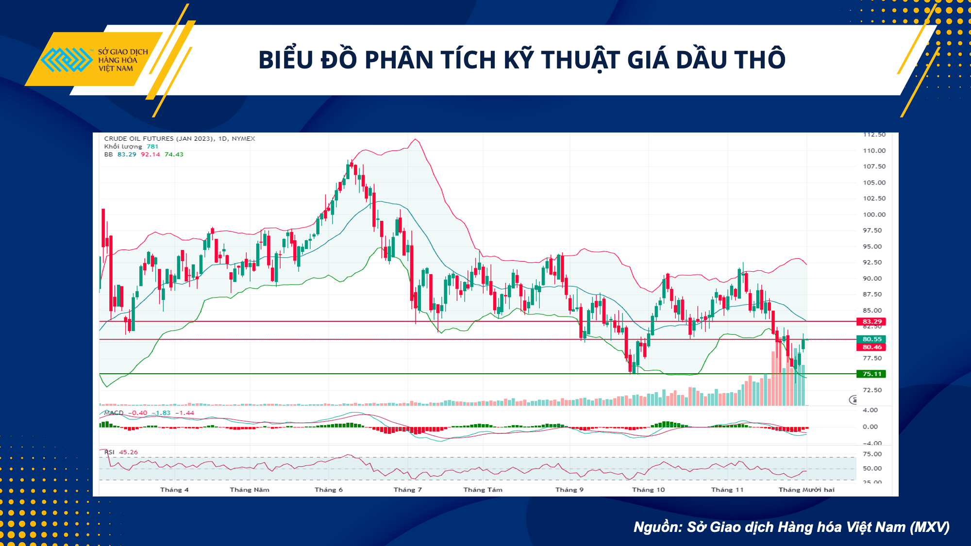 Giá dầu bật tăng rất tốt từ cạnh dưới của Bollinger Band, với các chỉ số RSI và MACD đang dần hướng lên trên. Tuy nhiên, thanh khoản của các phiên tăng điểm gần đây đang giảm dần, có thể là chỉ báo sớm cho đà tăng suy yếu. Nhiều khả năng giá sẽ test cạnh giữa của Bollinger band, tương đương mức 83,3 USD. Nhà đầu tư có thể canh mua trong khoảng 80 – 80,3 USD, với kỳ vọng chốt lời từ 82,5 – 83 USD.