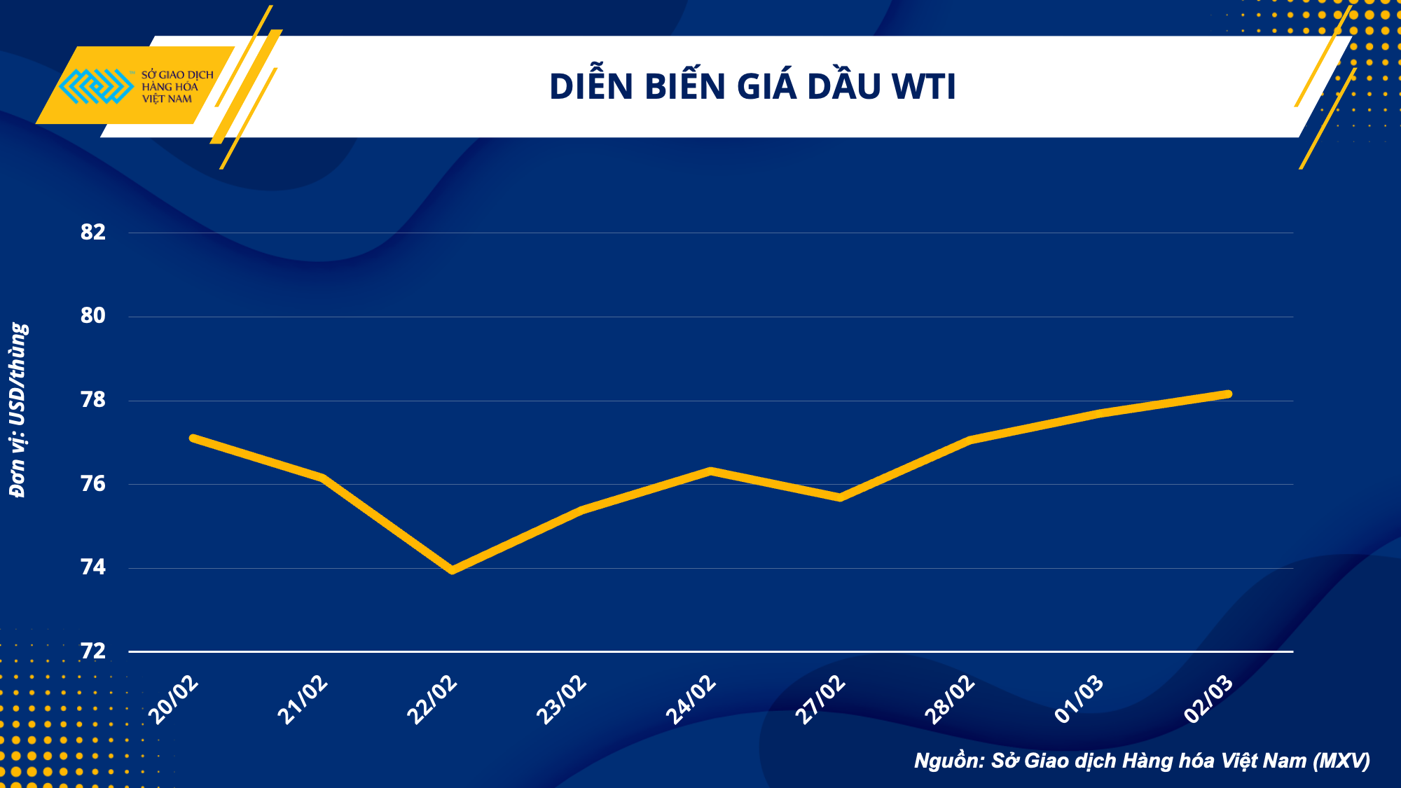Dầu thô ghi nhận phiên tăng thứ 3 liên tiếp trong phiên kết thúc ngày 02/03, nhưng mức tăng thu hẹp lại. Một phần, giá dầu nhận được sự hỗ trợ trước bức tranh nhu cầu tích cực tại khu vực châu Á, nhưng những áp lực vĩ mô tại khu vực châu Âu và Bắc Mỹ đã hạn chế đà phục hồi của giá dầu. Chốt phiên, giá dầu WTI tăng 0,6% lên mức 78,16 USD/thùng, dầu Brent tăng 0,51% lên 84,74 USD/thùng.