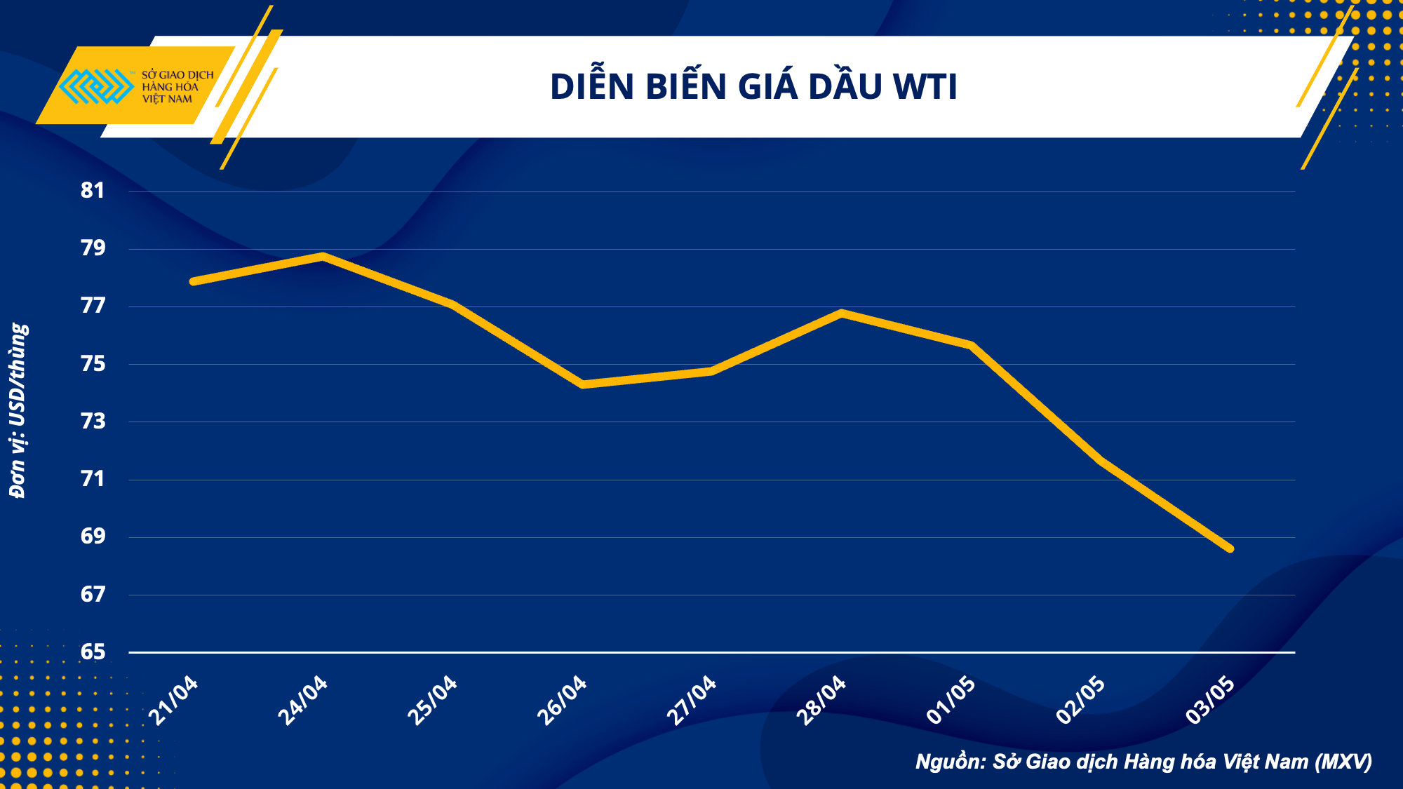 Kết thúc phiên 03/05, giá dầu thô WTI giảm 4,27% về 68,60 USD/thùng, và giá dầu thô Brent giảm 3,97% về 72,33 USD/thùng. Đáng chú ý, giá cả hai mặt hàng dầu thô đều đang thấp nhất kể từ cuối tháng 3.