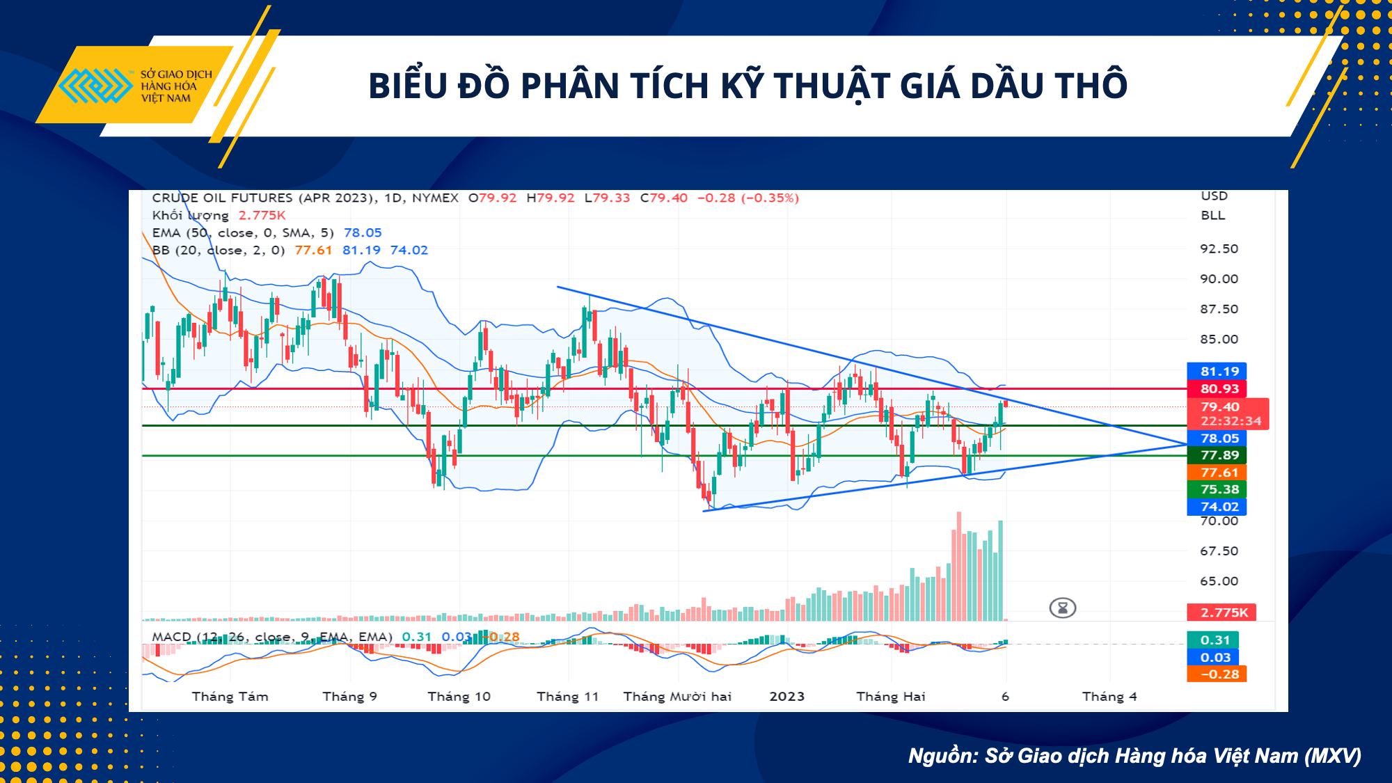 Về mặt kỹ thuật, phiên tăng vọt của dầu thô vào cuối tuần trước nhiều khả năng sẽ khiến giá dầu hôm nay suy yếu do lực bán chốt lời. Giá cũng chạm trendline giảm và kháng cự 80 USD/thùng. Giá có thể về cạnh giữa dải Bolinger Band và EMA50 trên khung Daily và H4. Nhịp giảm kỹ thuật nếu mở vị thế nên bán ngắn. Các nhà đầu tư có thể mở bán ở vùng 79,5 USD và chốt lời dần tại 78,5 USD và 78 USD.