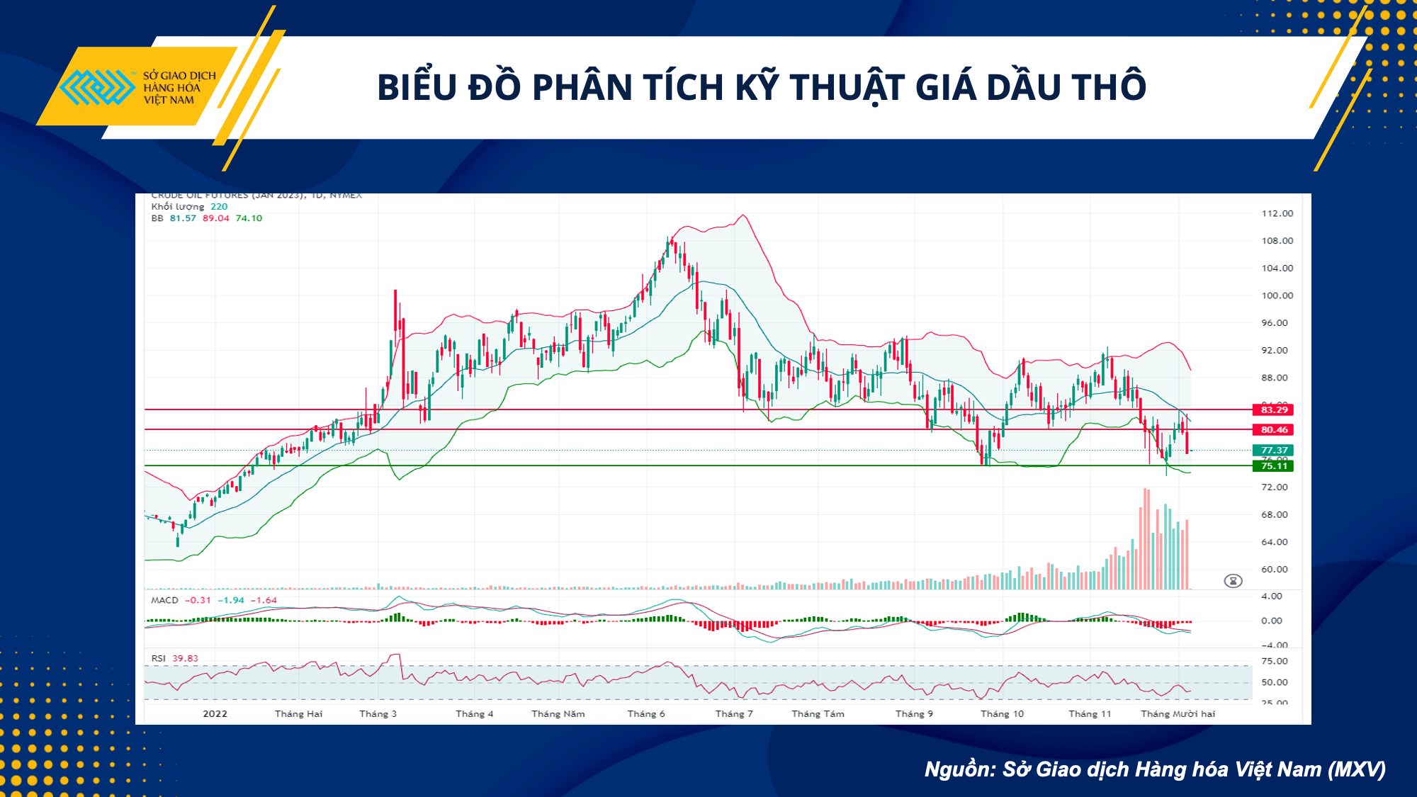 Về mặt kỹ thuật, giá dầu WTI giảm khi chạm kháng cự là cạnh trên của Bollinger Band, tương đương mức hỗ trợ tâm lý 80 USD/thùng. Chỉ số MACD và RSI vẫn còn yếu, nhất là chỉ số RSI vẫn không thể vượt qua mức 50 điểm. Nhiều khả năng giá sẽ kiểm nghiệm lại vùng hỗ trợ cũ là 75 USD. Nhà đầu tư có thể mở vị thế bán từ 78 – 78,5 USD, với kỳ vọng chốt lời ở mức 76 USD.