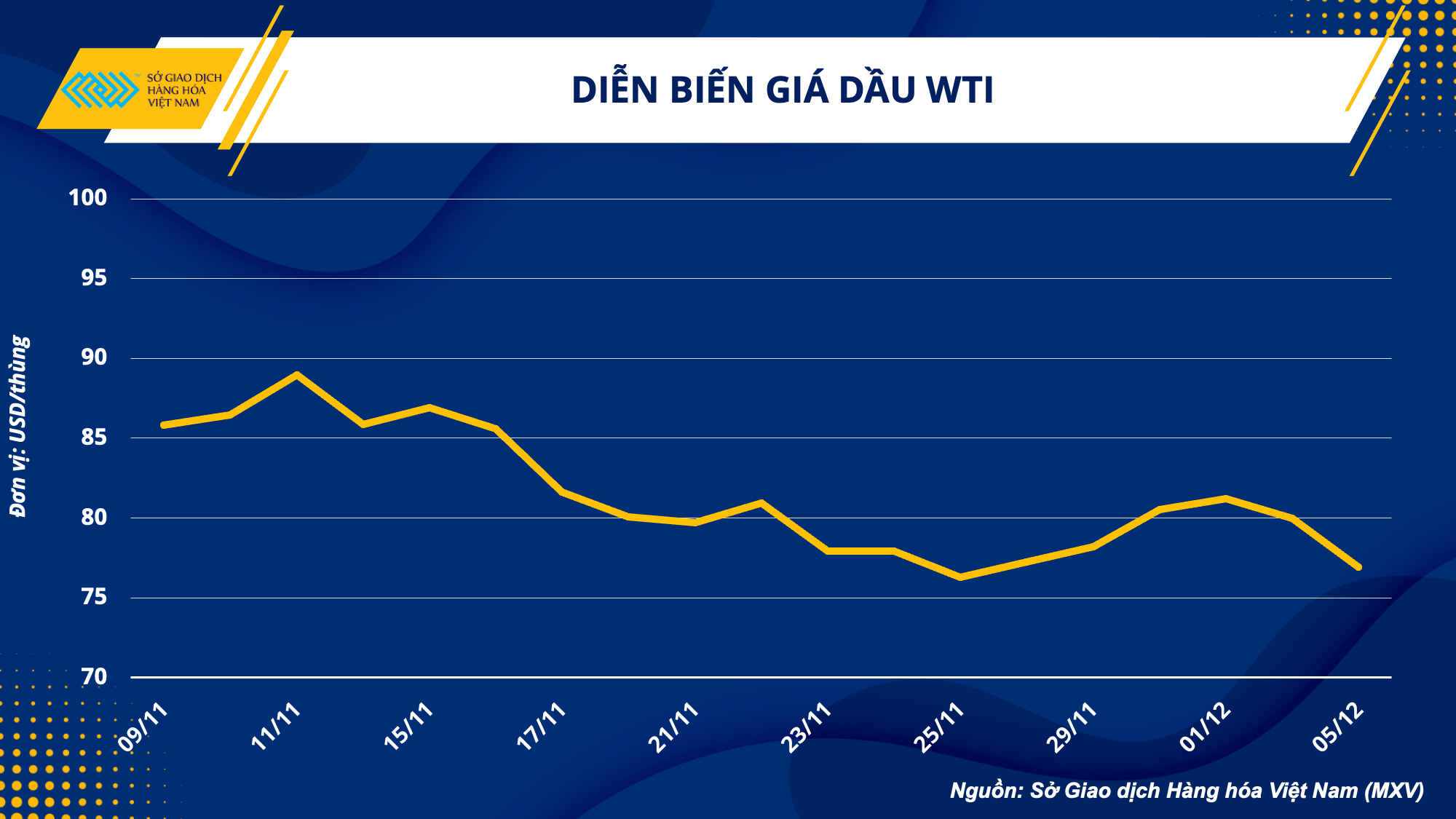 Sắc đỏ áp đảo bảng giá năng lượng trong phiên giao dịch đầu tuần. Kết phiên 05/12, giá dầu thô WTI đánh mất mốc 80 USD, giảm 3,81% về 76,93 USD/thùng, giá dầu thô Brent giảm 3,38% còn 82,68 USD/thùng.
