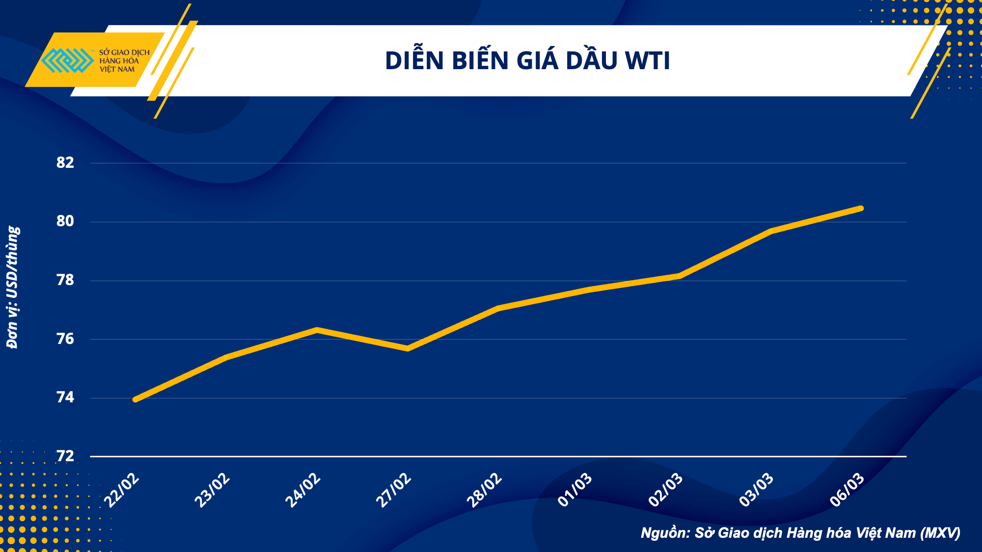 Thị trường dầu thô tiếp tục trải qua biến động mạnh trong phiên giao dịch đầu tuần. Kết thúc phiên 06/03, giá dầu thô WTI tăng 0,98% lên 80,46 USD/thùng, giá dầu thô Brent tăng 0,43% lên 86,20 USD/thùng. Giá cả hai mặt hàng dầu thô đều đang ở mức cao nhất trong gần một tháng.