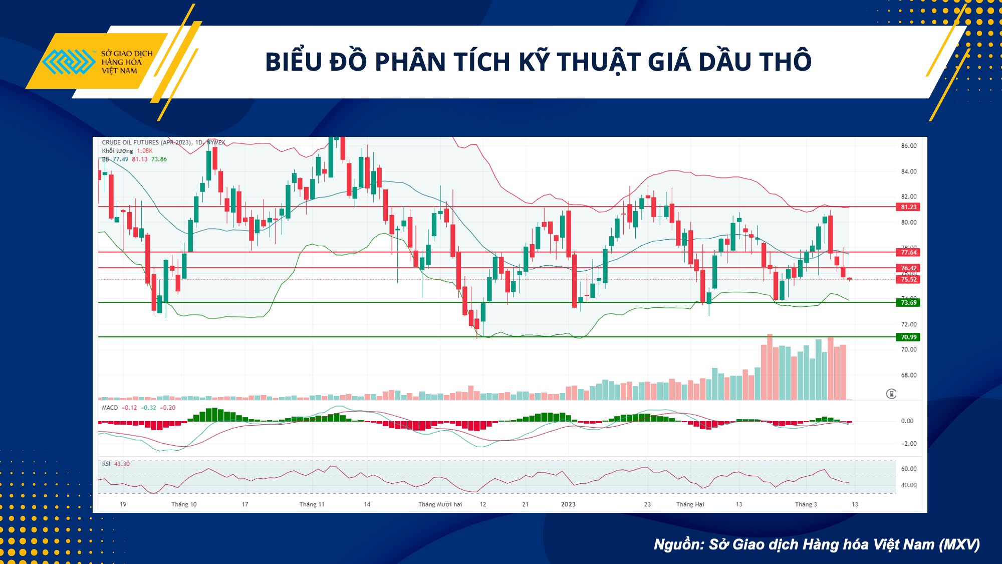 Giá dầu có phiên thứ hai liên tiếp kiểm nghiệm thất bại vùng cạnh giữa của Bollinger Band. Chỉ số RSI cũng đã xuyên qua mức 50 điểm và đang tiếp tục hướng xuống. Phiên giảm thứ ba liên tiếp kèm khối lượng giao dịch tăng cho thấy đà giảm có thể tiếp tục được duy trì. Nhà đầu tư có thể tiếp tục nắm giữ lệnh bán. Nếu chưa có vị thế, nhà đầu tư nên mở trong khu vực 76,1 – 76,4 USD, với kỳ vọng chốt lời ở mức 74,8 USD.