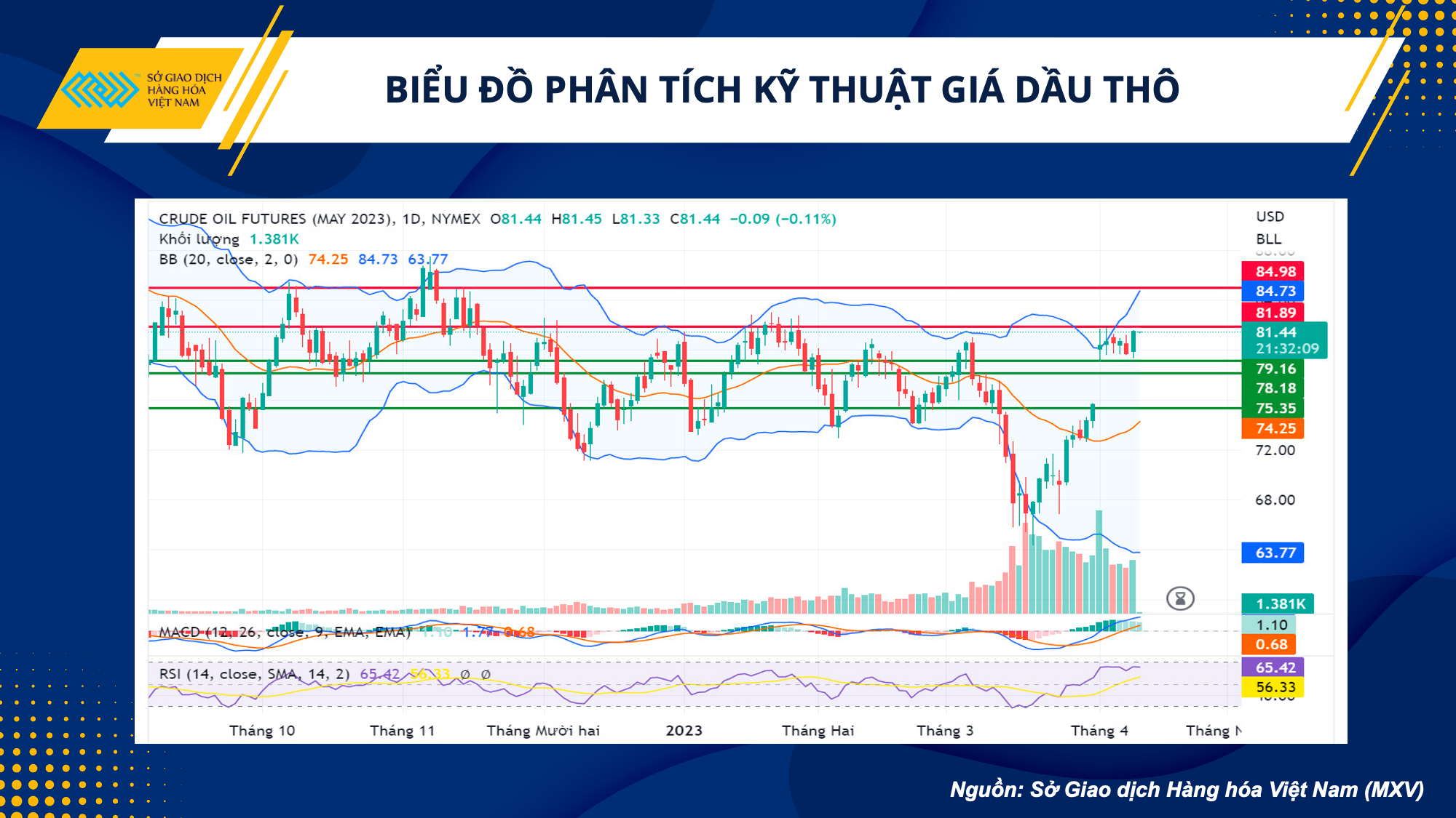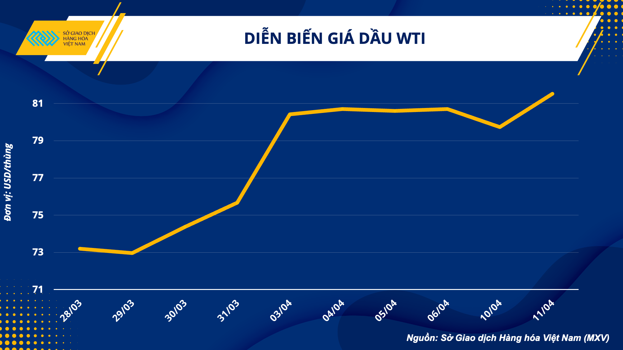 Giá dầu WTI hiện vẫn chưa thoát khỏi vùng đi ngang kể từ sau khi gap-up ngày 03/04, và nhiều khả năng sẽ tiếp tục dao động trong khoảng này. Khối lượng giao dịch tăng nhẹ trong phiên hôm qua nhưng nhìn chung vẫn đang khá mỏng. Dự báo giá tiếp tục sẽ nằm trong khoảng này trước thềm công bố dữ liệu lạm phát Mỹ. Các nhà đầu tư có thể mở bán tại 81,8 – 82 USD/thùng với kỳ vọng chốt lời 80,5 – 80,7 USD/thùng.