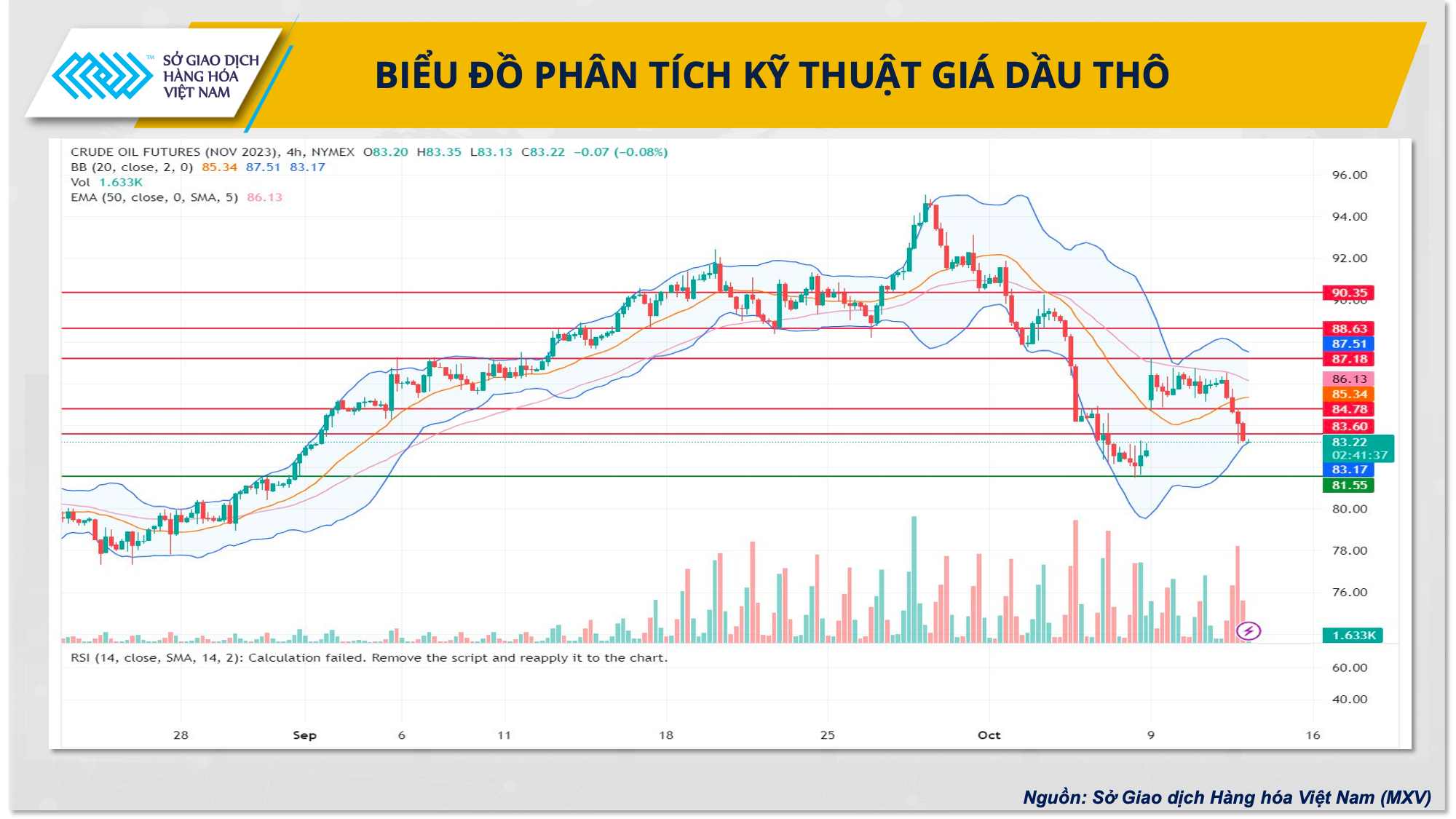 Về mặt kỹ thuật, giá dầu đã hoàn thành việc lấp gap-up đầu tuần, phá vợ vùng hỗ trợ 85 USD và trở về vùng giá 83 USD. Đường EMA50 đang hướng xuống, giá di chuyển nửa dưới của dải Bollinger Band.