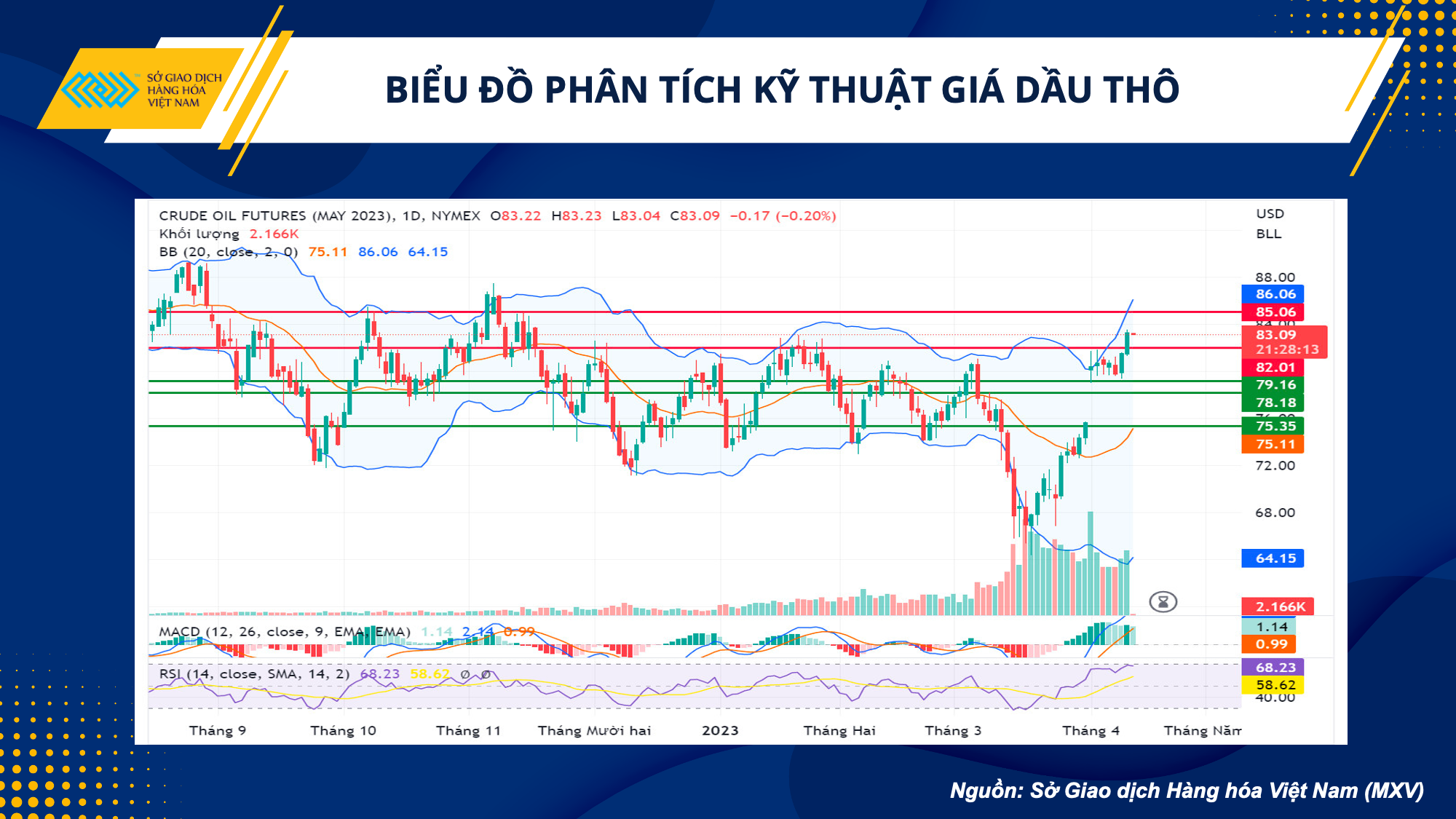 Đồng USD suy yếu kéo chỉ số Dollar Index có phiên giảm mạnh thứ 2 liên tiếp với mức giảm 0,69%. Đồng bạc xanh yếu hơn khiến dầu được định giá bằng USD rẻ hơn đối với những người mua nắm giữ các loại tiền tệ khác, hỗ trợ cho dầu WTI phá vỡ khoảng đi ngang sau khi tạo gap-up ngày 03/04, vượt lên trên kháng cự 82 USD/thùng.
