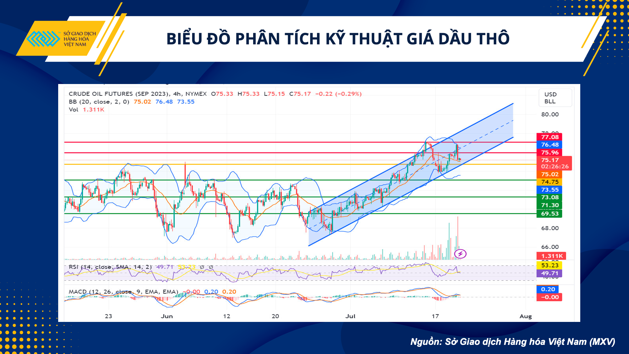 Giá dầu bật tăng trở lại khi chạm vùng hỗ trợ 74,6 USD, tiếp tục di chuyển trong kênh tăng giá nhưng biên độ đang khá hẹp, chịu áp lực bởi kháng cự vùng 76 USD. Thanh khoản đang khá thấp, trong khi thiếu vắng các thông tin cơ bản mới mang tính đột phá, nên nhiều khả năng giá sẽ tiếp tục dao động trong vùng 76 – 74,7 USD. Nhà đầu tư có thể bán ngắn về vùng 74,8 USD. Lưu ý việc giá vượt lên 76,3 USD sẽ củng cố đà tăng lên vùng 77,1 USD, trong khi phá vỡ vùng hỗ trợ 74,7 USD sẽ đưa giá về mục tiêu