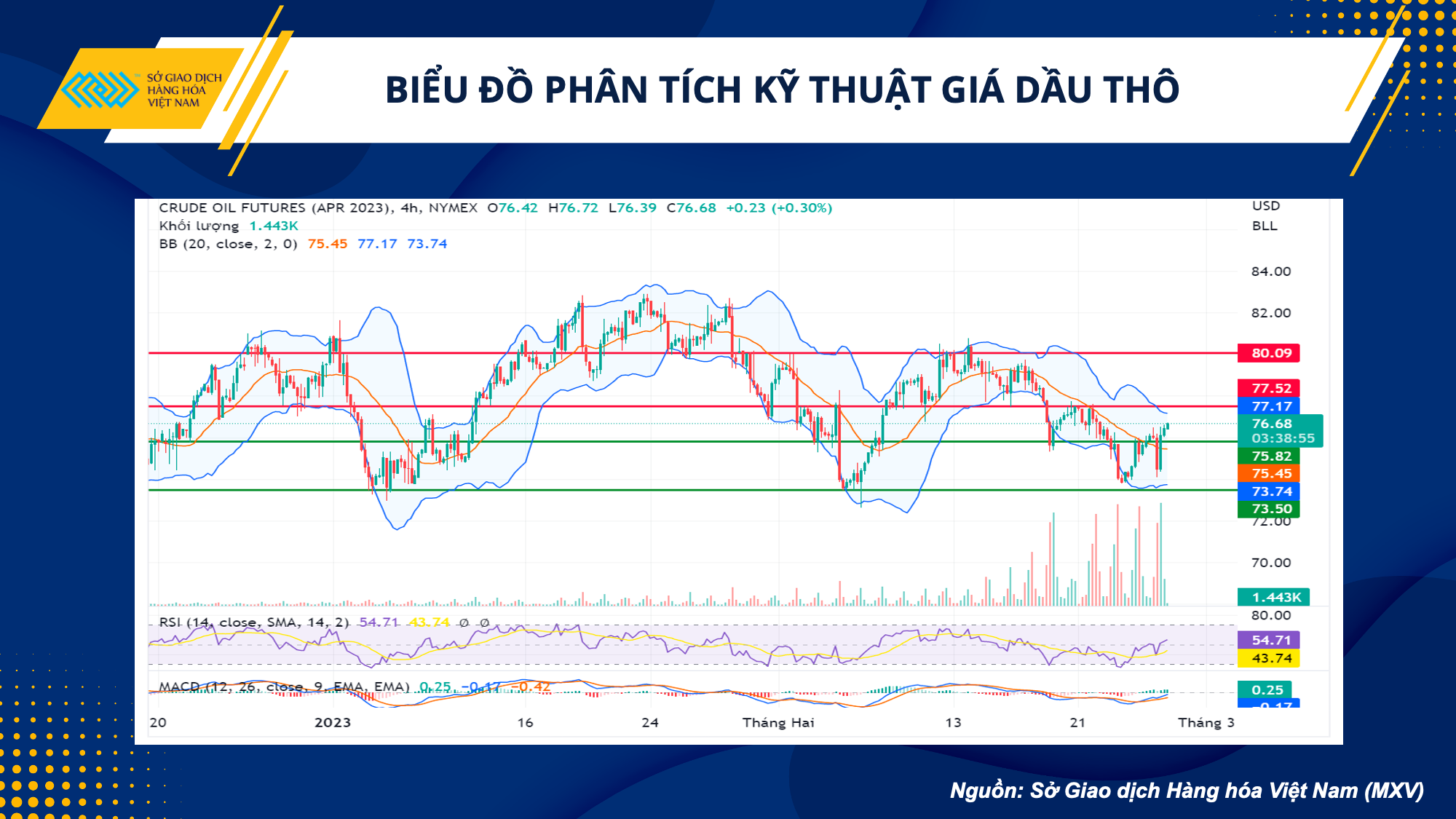 Về mặt kỹ thuật, trên khung H4, giá dầu vượt lên trên cạnh giữa của dải Bollinger Band. RSI hướng lên và quay trở lại vùng tích cực, biểu thị lực mua đang dần chiếm ưu thế. Nhiều khả năng giá dầu sẽ hướng đến kháng cự 77.5 USD/thùng trong phiên hôm nay, Các nhà đầu tư có thể đợi giá test lại cạnh giữa dải Bollinger Band ở mức 75.8 USD với kỳ vọng chốt lời tại 77.5 USD.